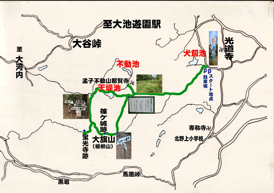 | 大旗山散策ルート( 約5㎞ ) ビオトープ孟子入口集合・出発⇒不動山那賀寺⇒鶴者峠⇒大旗山篠ケ城跡⇒ビオトープ孟子資料館前⇒ビオトープ孟子入口(終着点) |